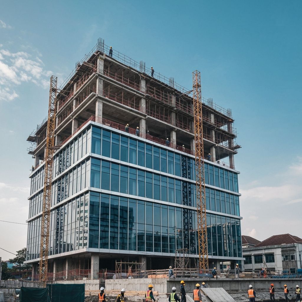Konstruksi gedung perkantoran berlantai 8 dengan fasilitas modern